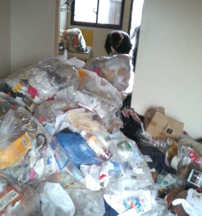 目黒区でゴミ屋敷状態にある実家を出て一人暮らしをすることに決めた息子さんからの依頼を受けました。ゴミ屋敷状態になっている実家の部屋の中から自分の生活に必要な物を探し出して梱包なども手伝って欲しい、ということでした。また、時間があれば実家のゴミの片づけを少しお願いしたい、とも言われました。ご両親が仕事で不在の深夜に伺い、膝高までゴミが積もった部屋の中から息子さんの衣類や本、棚などを探し出し綺麗に梱包しました。探し物の際に邪魔になったゴミは外のトラックにどんどん積み込んでいきました。